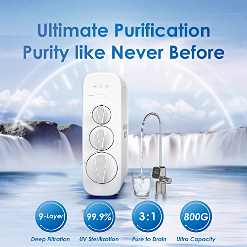 Waterdrop G3P800 Reverse Osmosis System, 800 GPD Fast Flow, NSF/ANSI 42 & 53 & 58 & 372 Certified, 3:1 Pure to Drain, Tankless Under Sink RO Water Filter System, LED Purifier, Smart Faucet
